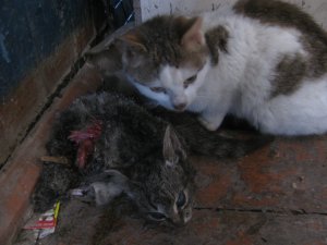 странная кошка... интересно, первого она живого разорвала чтоль? Ну этот сам откинулся, я его вынес, смотрю нету... а она уже доедает