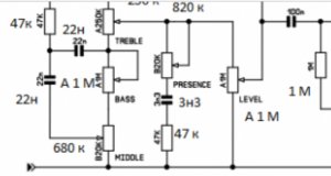 Входной сигнал с гитары подаётся на вход IN, выходной сигнал, готовый для подачи на оконечный усилитель снимается с выхода OUT, при этом в схеме имеются 6 регулировок.