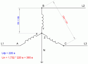 Я так понял три фазы - это три шнурка по 220В относительно 0? А 380В получается за счет фазосдвига на каждой фазе?
