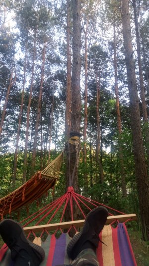 Но не мешает. Наоборот - для антуражу ещё лучше!))). Свежо! Комаров прибивает... У нас же шатёр большой. В нём - большой стол. Но за ним - пару раз в день на пару часов)))  А так сидим, обычно, рядом, возле костра. Там-же можно на гамаках полежать... туда-же взять с собой пЫво и со стола тарелку вкусняшек... Ну, или набрать пирожных-сладостей и сделать себе чай/кофе/какао... Котёл с водой всегда висит на треноге..По крайней мере, всегда, когда там нет другого котла с шурпой, или глинтвейном.))))