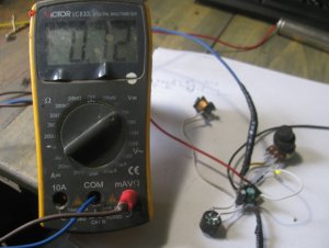 Дальше у меня возникла такая мысля. Там есть нога 4, генератор будет работать, если подавать на нее > +0.7В. Я собрал делитель и подрегулировал его так, чтобы схема заводилась ну прям "на грани".
