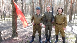 На верхней фото... Тяжело бедному, водичкой поят... И штаны расстегнули, пока жены нет...   Жена ведь в черной, танкистской форме?
