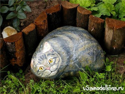 На любом огороде найдется хоть один камень внушительных размеров, который обычно валяется в самом дальнем углу участка. Преобразить его помогут обычные краски и Ваша фантазия. Для начала следует вымыть камень от грязи песка. Дать ему некоторое время, чтобы он обсох. Затем с помощью красок и кисточки можно нарисовать на камне любого зверя, на которого, как Вам кажется, похож по силуэтам камень. Конечно, такой зверь не заменит настоящих питомцев, но зато в Вашем саду появится оригинальное украшение, сделанное из обычного серого монолита.