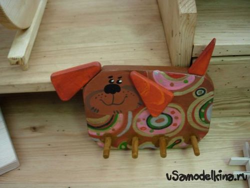Затем изготовьте два уха и хвостик из той же доски. Дрелью просверлите четыре отверстия в основании и поместите туда круглые заготовки цилиндрической формы, которые будут служить крючками для одежды. Затем необходимо раскрасить поделку любыми цветами радуги, которые приходятся Вам по вкусу. Теперь ушки и хвостик приколачиваются маленькими гвоздиками к каркасу, а крючки фиксируются при помощи клея или тех же гвоздей. Все поделку после сборки обработайте лаком, чтобы она долго время радовала Вас и Ваших гостей.