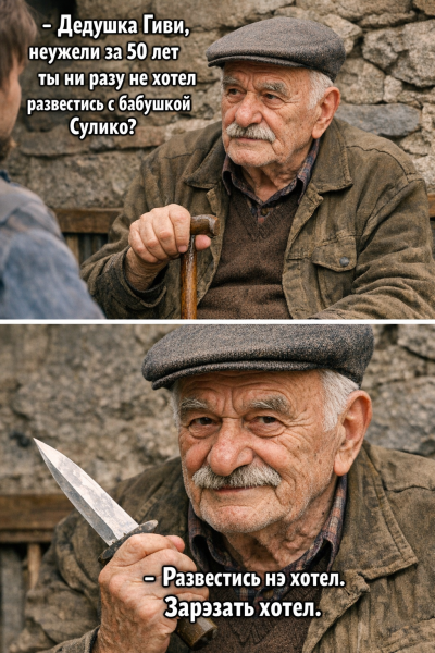 Ночь. Супружеская спальня, жена засыпает и думает:"Завтра пятнадцатилетие свадьбы. Интересно, что подарит?" Муж тоже думает:"Если бы сразу после свадьбы задушил, завтра бы уже точно вышел...